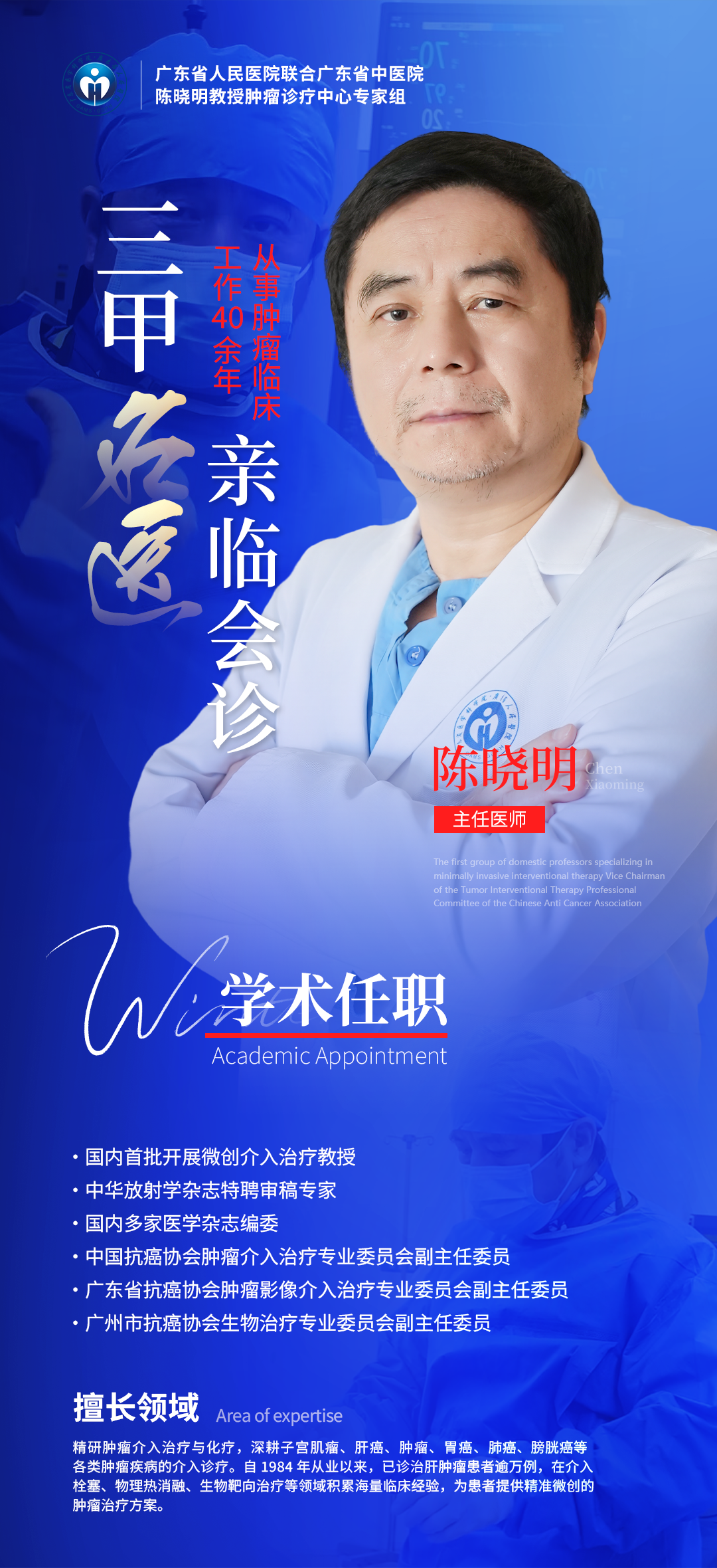 从深耕广东省人民医院介入科临床一线,到担任广州东方医院肿瘤科首席技术官推动技术落地,再到独创BOC载药介入治疗开辟肿瘤治疗新方向,陈晓明主任用近四十年的坚守,诠释了“大医精诚”的真谛,以微创技术破癌局,以仁心大爱护苍生。他让更多人知道,肿瘤治疗并非只有手术、化疗两条路,介入微创治疗作为第四种核心治疗方式,为无数绝境患者带来新生。未来,他将继续坚守介入临床一线,用精湛医术、赤诚仁心、创新技术,为更多肿瘤患者点亮生命希望,守护万家安康。